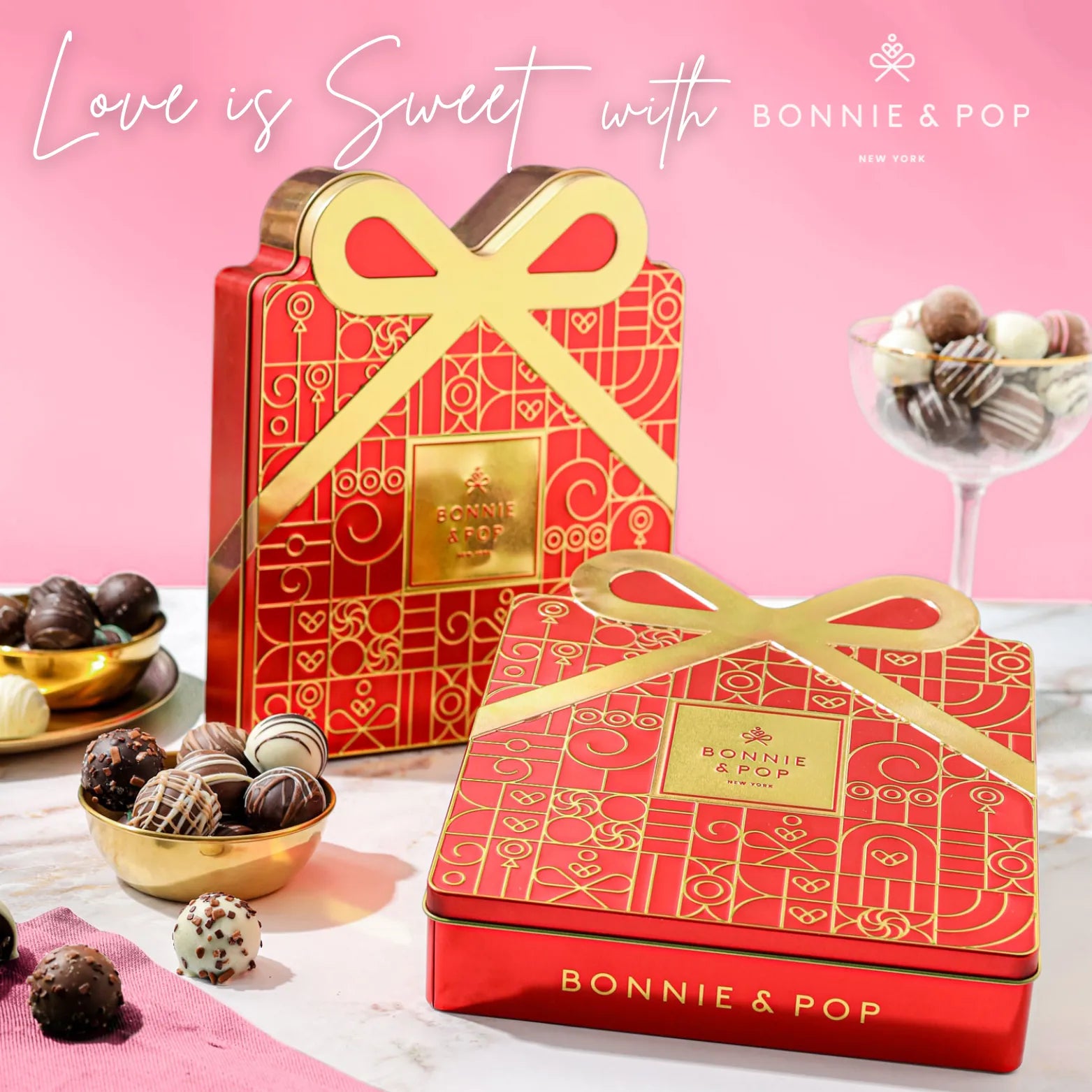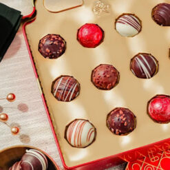 Celebrate with our brand new collection! Adorned with a luxurious gold bow embossed on the lid. Inside. discover a delightful assortment of 12 handcrafted Belgian chocolate truffles. each crafted to perfection. Savor the rich flavors. from the indulgent Milk Chocolate Caramel to the creamy White Chocolate Tiramisu. This exquisite collection makes the perfect festive gift. sure to bring warmth and sweetness to any holiday gathering. Treat yourself or someone special to a taste the magic!