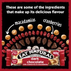 A fruity and indulgent treat made with sharp cranberries. chewy sultanas. and creamy macadamias. finished with a generous undercoating of Belgian dark chocolate. Packed with real fruit and nuts. this bar delivers a burst of flavor in every bite. making it the perfect nutritious snack for on-the-go or at home.