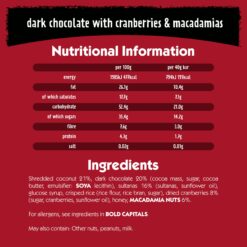 - Ingredients: Shredded coconut 21%. dark chocolate 20% (cocoa mass. sugar. cocoa butter. emulsifier: SOYA lecithin). sultanas 16%. glucose syrup. crisped rice. dried cranberries 8%. honey. macadamia nuts 6%