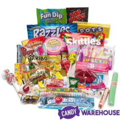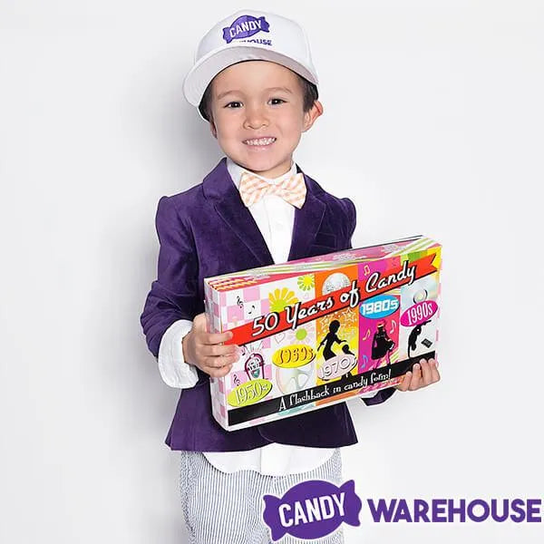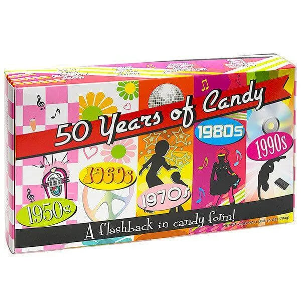 A flashback in sugar form. this giant candy gift box contains 50 years of old fashioned candies from the 1950s. 1960s. 1970s. 1980s. and 1990s! So take a trip in this confectionery time machine and experience the sweet memories all over again. A great gift for anyone who enjoys nostalgia and sweet treats from their childhood. this giant nostalgic candy gift box is sure to surprise and delight any recipient.