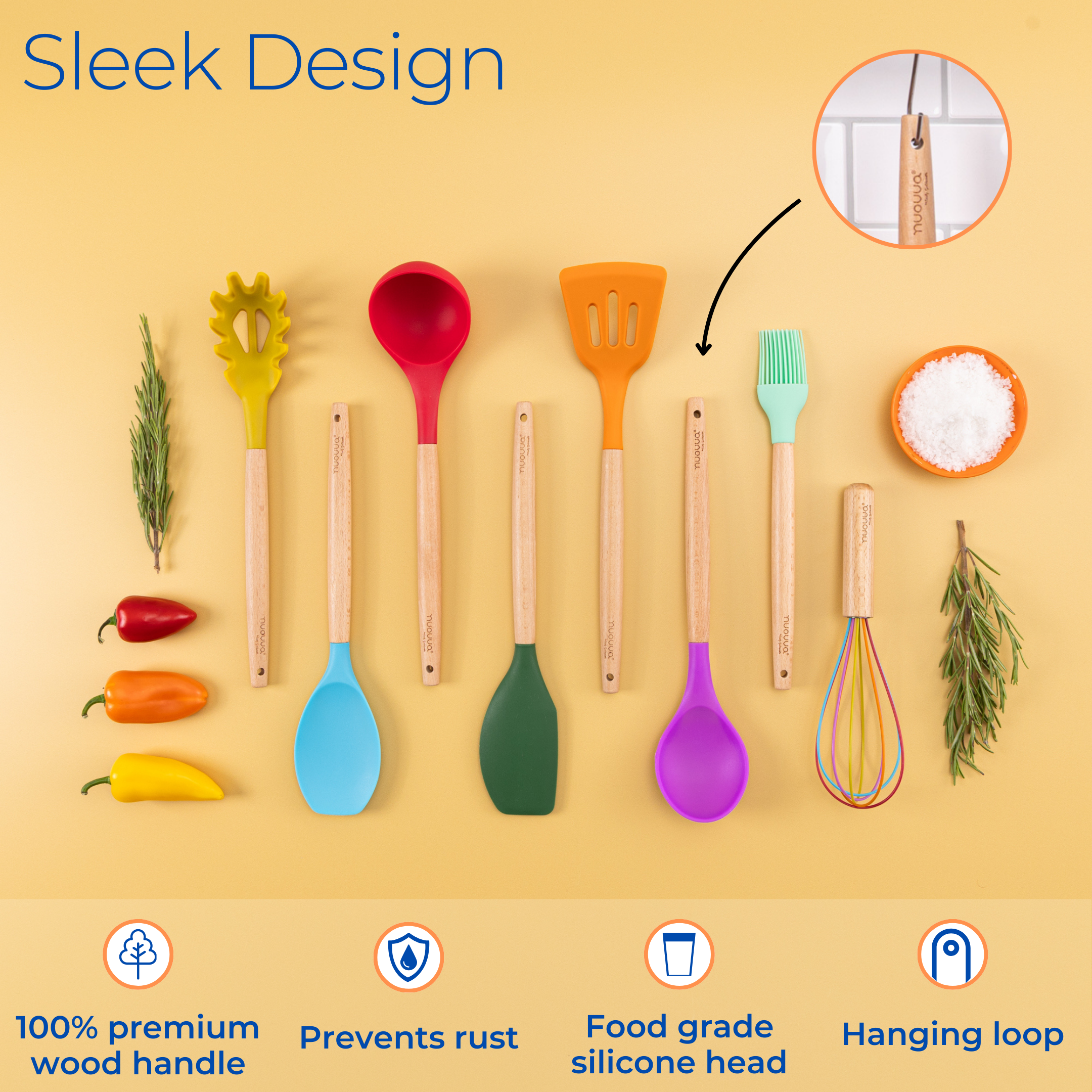 - STYLISH FUNCTION: The elegant design of our essential cooking utensils with wood handles adds a touch of sophistication to your kitchen while ensuring functionality and durability. The ergonomic handles provide a comfortable grip. reducing hand fatigue during extended use. Each utensil is thoughtfully designed to balance beauty and practicality. making your cooking tasks more enjoyable!
