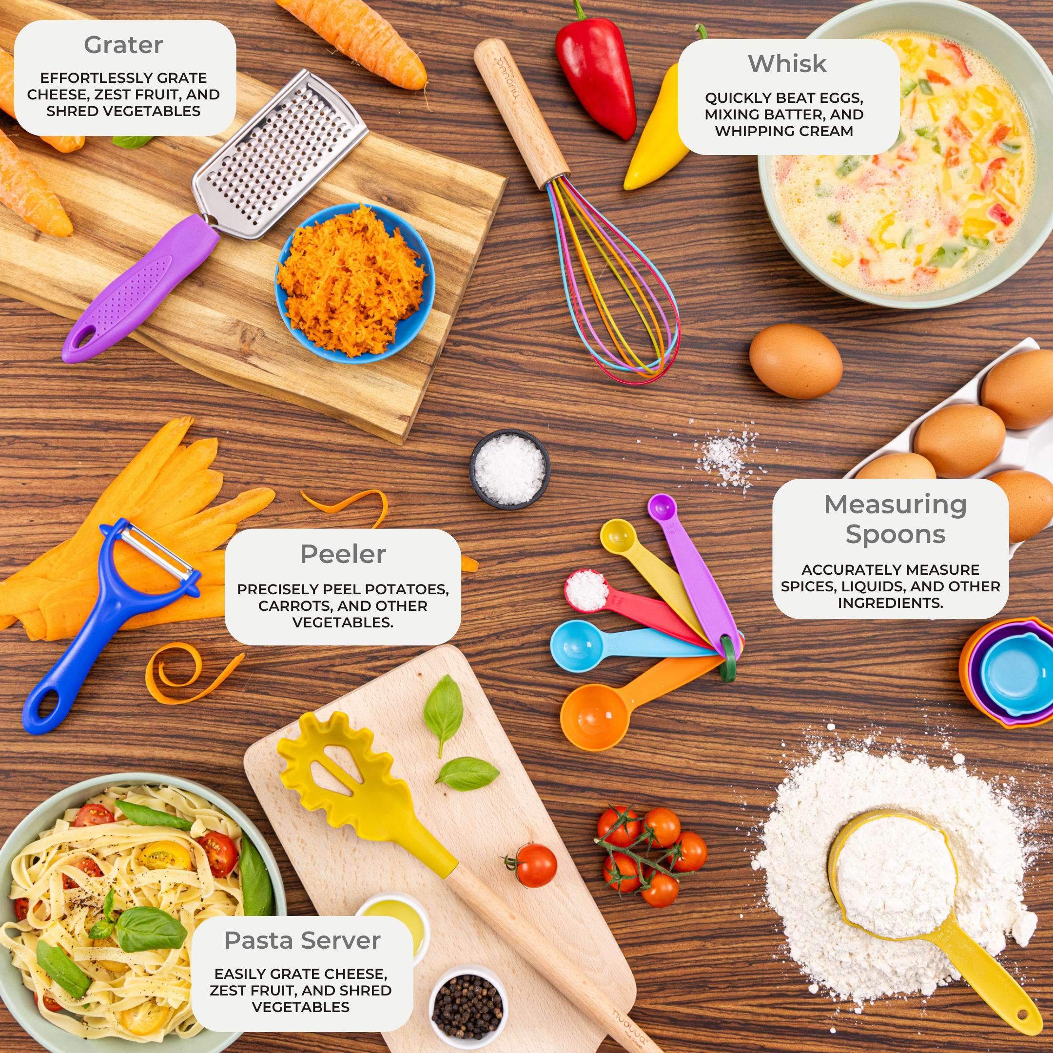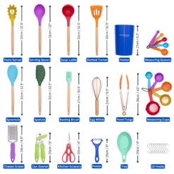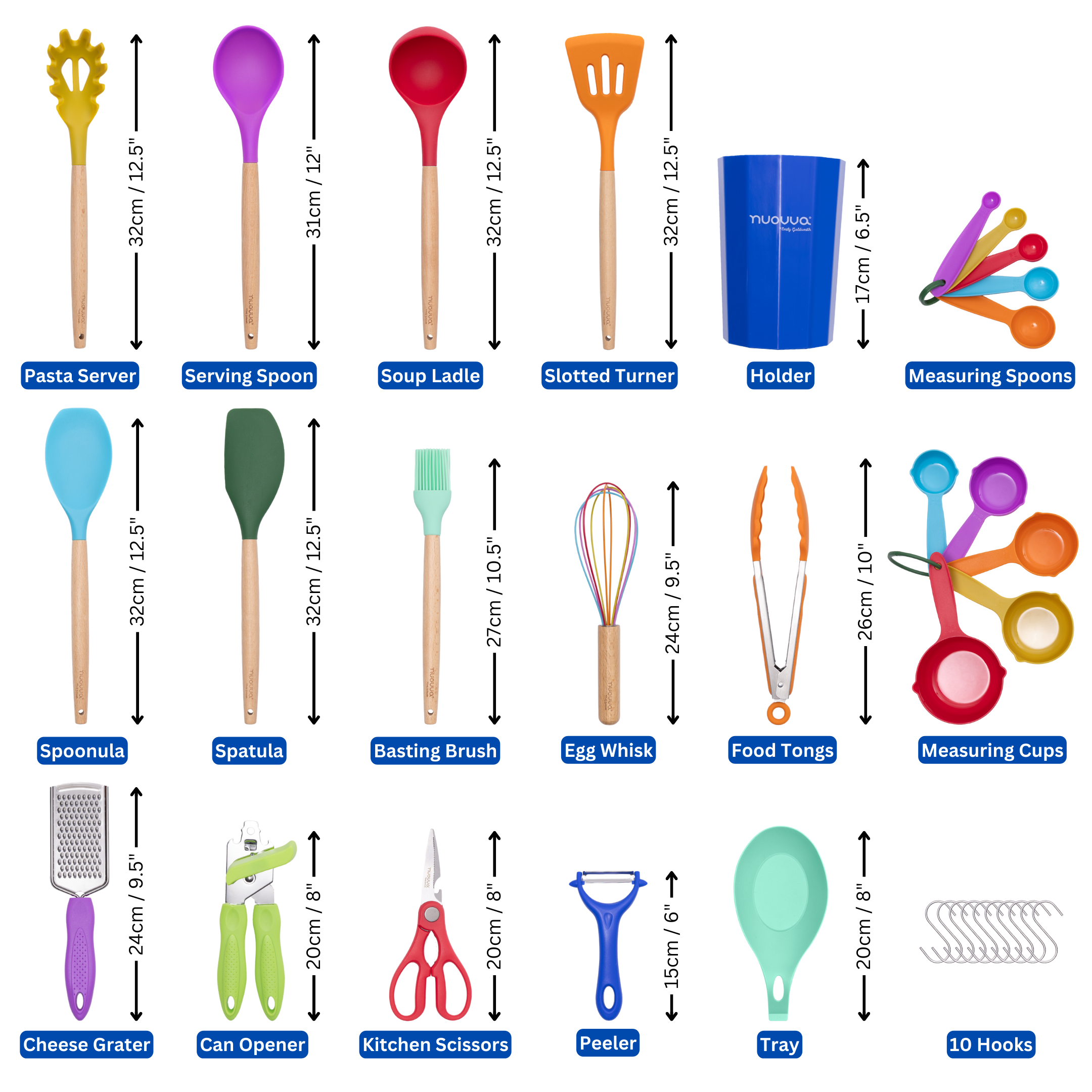 - COMPLETE 35PCS SET: This comprehensive kitchen utensil set by Nuovva includes all the essential tools for your kitchen needs: spatula. soup ladle. slotted turner. spoonula. pasta server. serving spoon. basting brush. egg whisk. food tongs. cheese grater. peeler. can opener. kitchen scissors. utensils holder. 5 measuring cups. 5 measuring spoons. spoon rest. and 10 hanging hooks. Say goodbye to mismatched. worn-out utensils and enjoy the convenience of a complete. coordinated set!